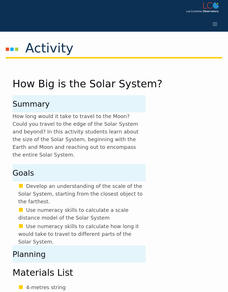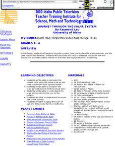 Students measure the actual size and distance of the solar system using scale and ratio. They watch and discuss a video, create a distance-scale solar system model, and compare the scale sizes of planets to their actual sizes.