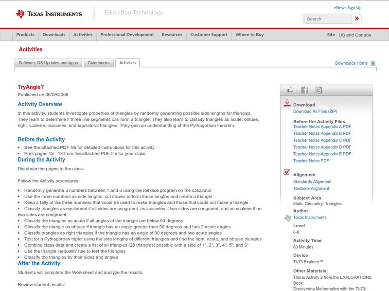In this activity, students investigate properties of triangles by randomly generating possible side lengths for triangles. They learn to determine if three line segments can form a triangle. They also learn to classify triangles as...