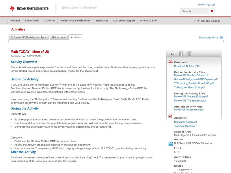 In this activity students will investigate exponential functions and their graphs using real-life data. Students will analyze population data for the United States and create an exponential model for the scatter plot.