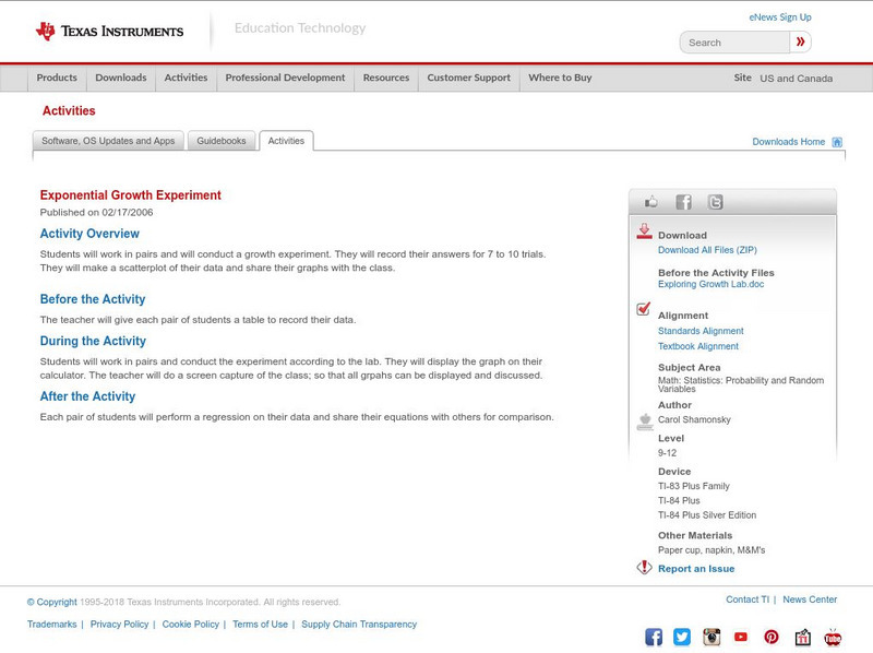 Students will work in pairs and will conduct a growth experiment. They will record their answers for 7 to 10 trials. They will make a scatterplot of their data and share their graphs with the class.