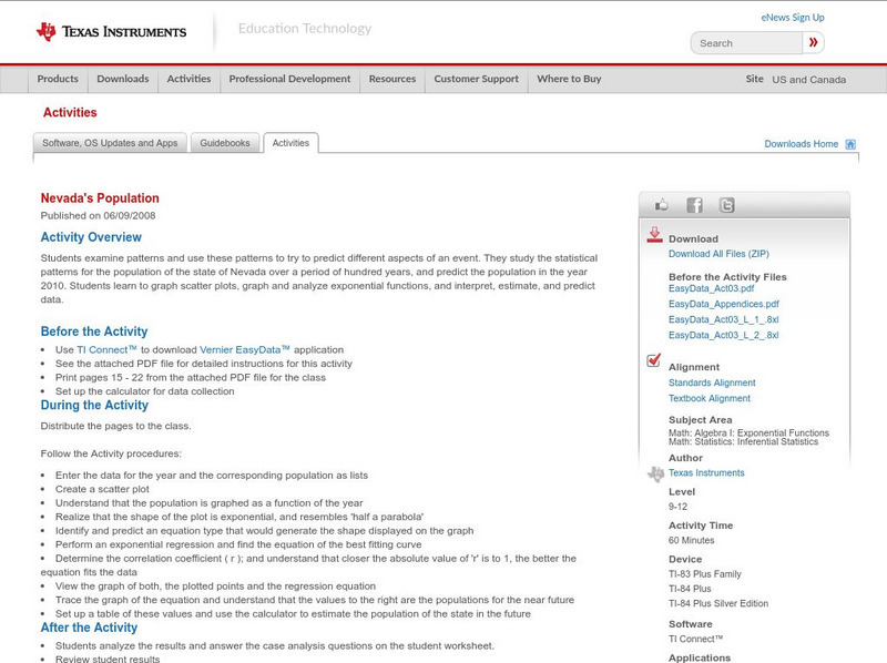 In this activity, students examine patterns and use these patterns to try to predict different aspects of an event. They study the statistical patterns for the population of the state of Nevada over a period of hundred years, and predict...