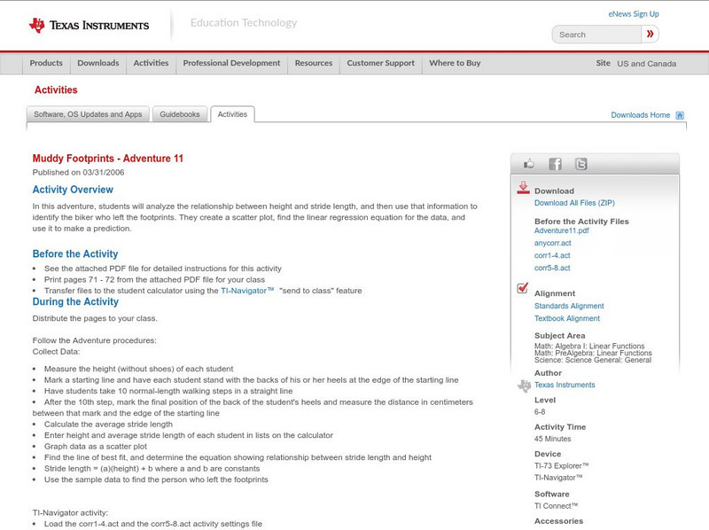 In this adventure, students will analyze the relationship between height and stride length, and then use that information to identify the biker who left the footprints. They create a scatter plot, find the linear regression equation for...