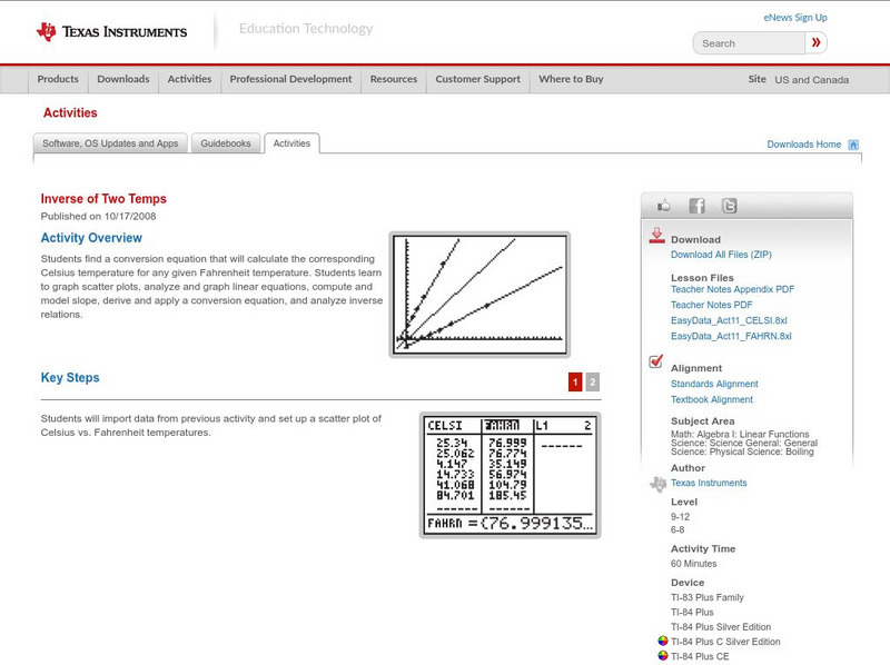 In this activity, students find a conversion equation that will calculate the corresponding Celsius temperature for any given Fahrenheit temperature. Students learn to graph scatter plots, analyze and graph linear equations, compute and...