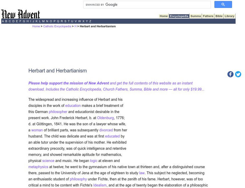 This article gives an overview of Herbart's life and work in psychology, philosophy and education. Please note that ?The Catholic Encyclopedia? is a historic reference source and should be viewed in the context of resource material dated...