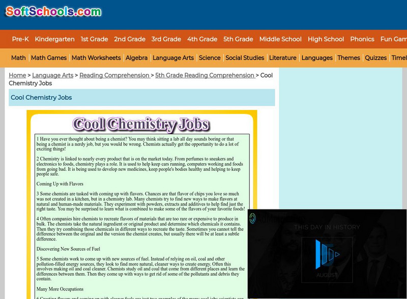 Read "Cool Chemistry Jobs," a short informational text, and then answer ten reading comprehension questions that follow.