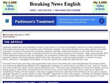 In this Parkinson disease activity, students read the article, answer true and false questions, complete synonym matching, complete phrase matching, complete a gap fill, answer short answer questions, answer discussion questions, write,...