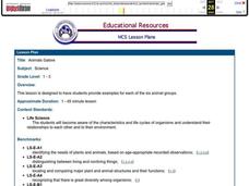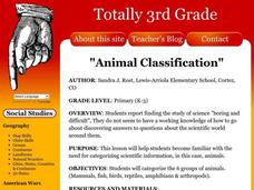 Students recognize the six groups of animals (Mammals, fish, birds, reptiles, amphibians and arthropods) and their characteristics. In this animal characteristics lesson, students sort animals by their traits. Students cut...