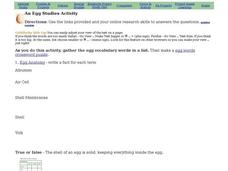 In this eggs worksheet, students click on the links to learn about eggs, make a table about eggs, and answer short answer questions. Students complete 15 questions.