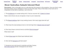 For this online/interactive worksheet about animals in Australia, students read questions which include links to the internet, click on the links to discover the answers, and write the answers. Students write 21 answers. Additional...