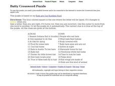 In this bats instructional activity, students complete a crossword puzzle about bats. Students complete 21 blanks inside the crossword puzzle.