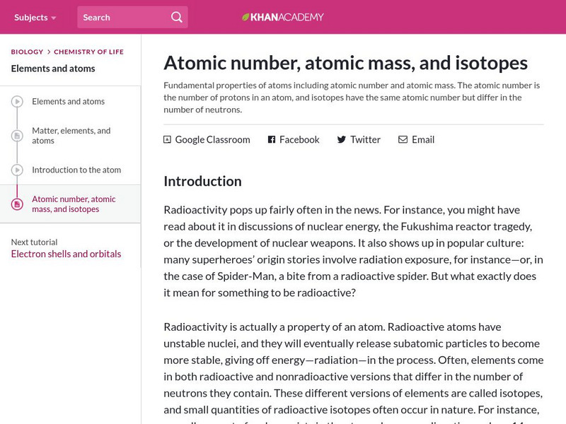 Khan Academy: Biology: Chemistry of Life: Atomic Number,atomic Mass,and Isotopes
