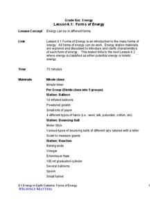 The amount of energy Americans use doubles every 20 years. The first lesson plan in a 10-part series teaches scholars about different forms of energy. They rotate through five stations with hands-on activities or experiments at each in...