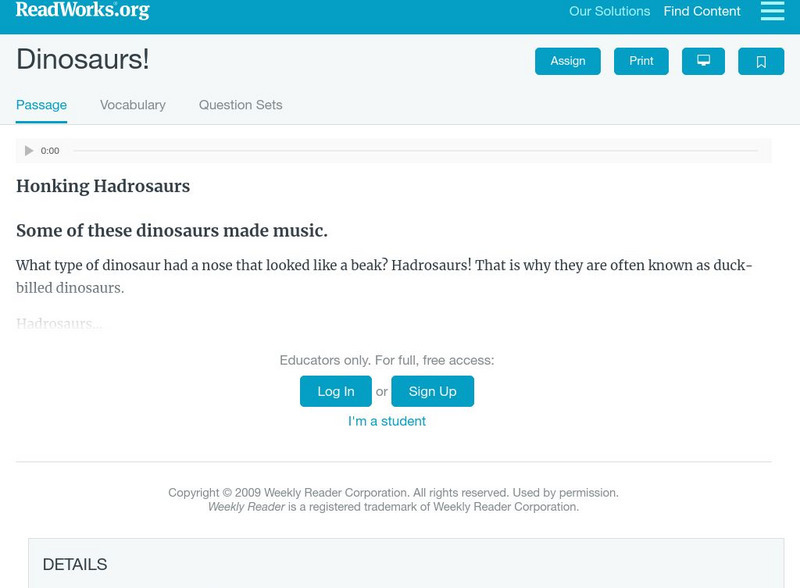 [Free Registration/Login Required] An informational text about a type of dinosaur called a hadrosaur. A question sheet is available to help students build skills in reading comprehension.