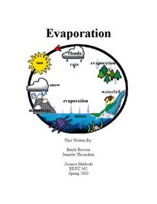 Fourth graders examine the concepts of evaporation and the water cycle. They describe the relationship between heat energy, evaporation and condensation of water on Earth and identify the sun as the source of energy that evaporates...