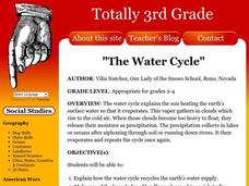 Second graders investigate the water cycle. In this water cycle lesson, 2nd graders discover how the water cycle effects erosion and weathering. Students create their own terrariums to view the water cycle. Students illustrate their...