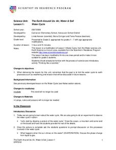 Young scientists explore Earth elements by conducting an experiment. They define water vocabulary terms such as condensation and precipitation. In addition, they conduct a water experiment in which they build a terrarium, so they can...