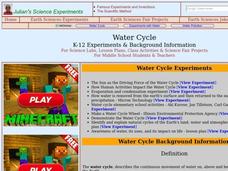 Young water cycle enthusiasts discover the water they have been using has been cycling around the earth for billions of years. Through presentations, learners will understand that water has three states and how these forms...
