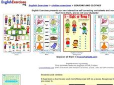 In this English instructional activity, students match appropriate clothing with the seasons. Students are given a list of choices and must choose which clothing is best for the weather of the given season.
