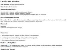 Students appreciate that many jobs are affected by the weather. In this weather and jobs worksheet students complete a worksheet explaining how various workers make changes in their routines due to weather.