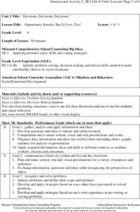 Sixth graders practice six steps to effective problem solving. Working with the school counselor, class members are presented with a scenario that requires them to make a decision. Individuals then write a reflection in which they...