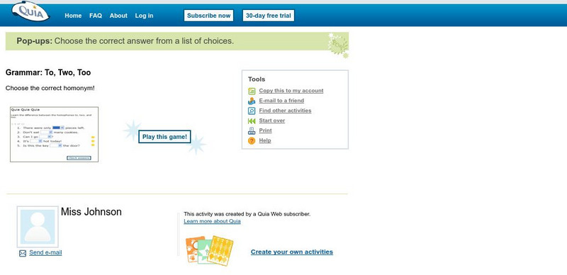 Twelve sentences in which students are asked to fill in the box by choosing the correct word: to, two, or too. Correct answers are provided for any missed questions, and a final score is tallied at the end of the exercise.
