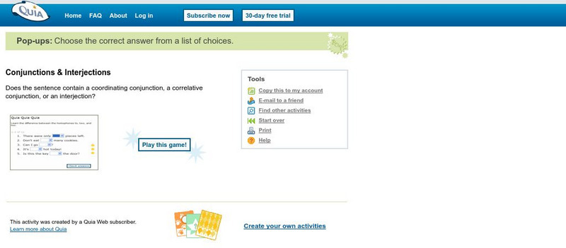 An interactive exercise where students read two sentences and then choose the conjunction that would best join them together. Correct answers are provided for any missed, and score is kept throughout the exercise.