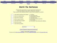 In this recognizing sentences with the same or nearly the same meanings online/interactive worksheet, students read two columns of statements and match the ones that have equivalent meanings. Students match 7 sentences and check their...
