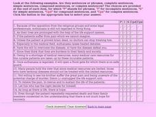 In this interactive sentences worksheet, students read 15 sentences about euthanasia then complete an interactive quiz where they determine the type of sentence or phrase used. Choices include, phrase, incomplete sentence, simple...
