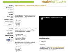 In this sentence completion practice worksheet, students choose the best word to complete the sentences. Students have 10 minutes to answer 12 questions in this SAT practice worksheet.