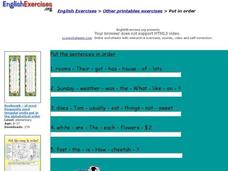 In this sentence order interactive worksheet, learners arrange the words of each sentence in proper order. There are five sentence scrambles to complete.