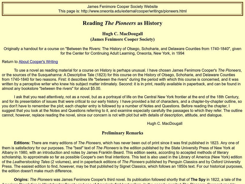 This detailed site provides a guide for reading "The Pioneers" by James Fenimore Cooper. Includes background information about the book, a description of the setting and form, a list and description of principal characters, and...