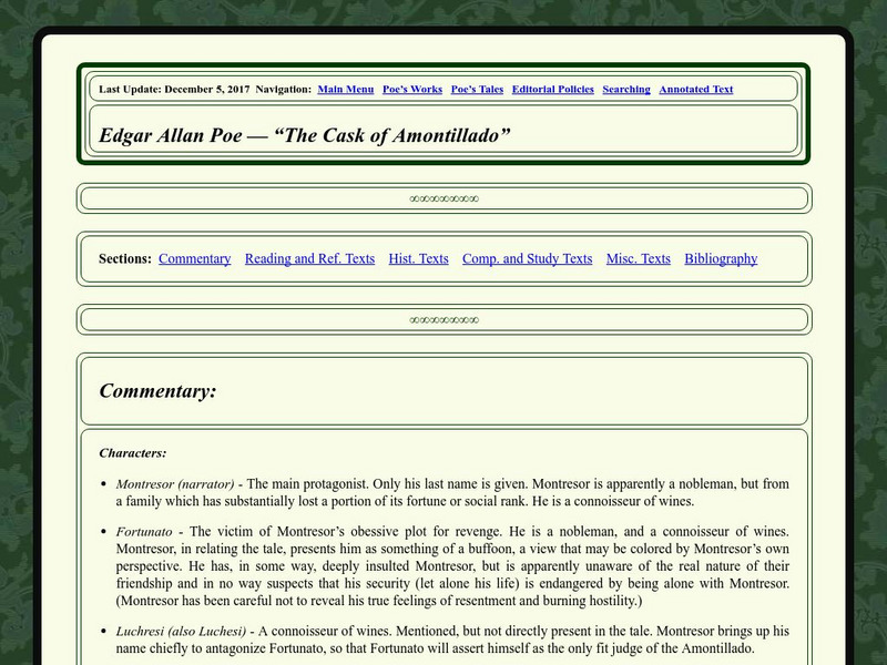 Read Edgar Allan Poe's famous tale "The Cask of Amontillado." Includes brief summaries of the characters and the setting.