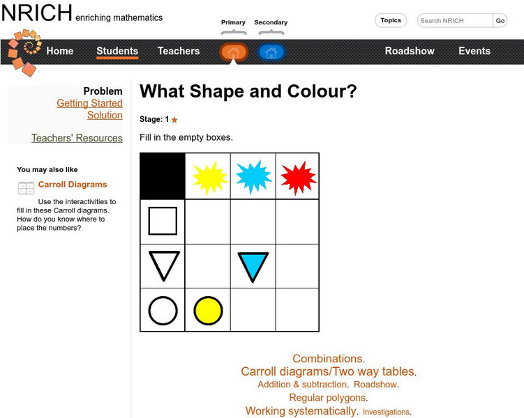 Fill in the chart and see which shapes and which colors belong in which rows and columns. The solution is readily available at this one page website.
