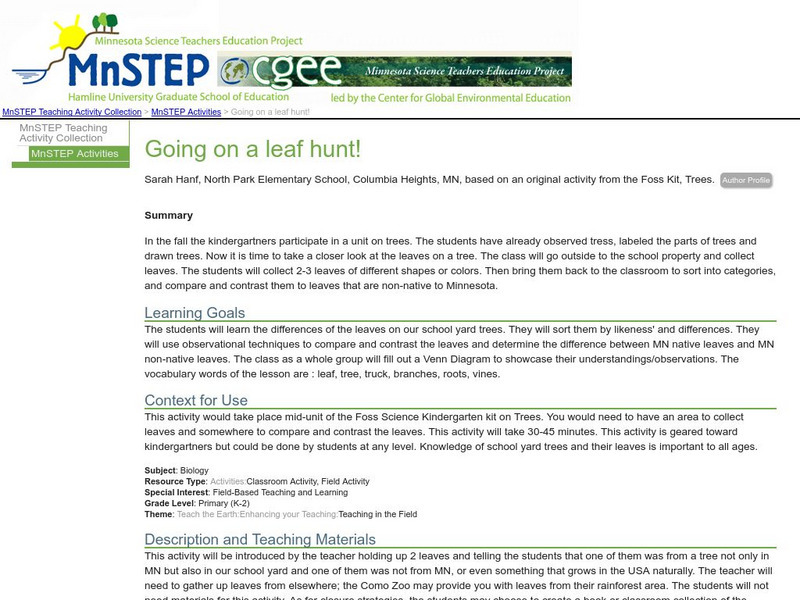 Students go outside take a closer look at leaves on a tree. The students collect leaves of different shapes or colors, and then sort into categories, and compare and contrast them to leaves that are non-native to Minnesota.
