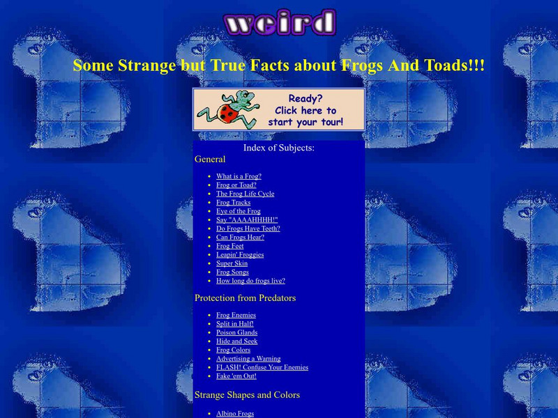 You will find general information, how frogs protect themselves from predators, strange frog shapes and colors, frogs and weather and more on this informative and thorough site.