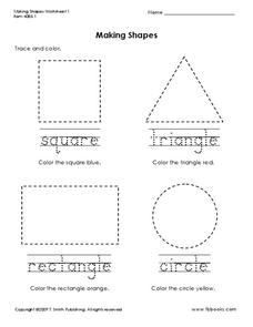 In this shapes worksheet, students identify and trace twelve shapes and then color them according to the directions. Students complete twenty-four activities.