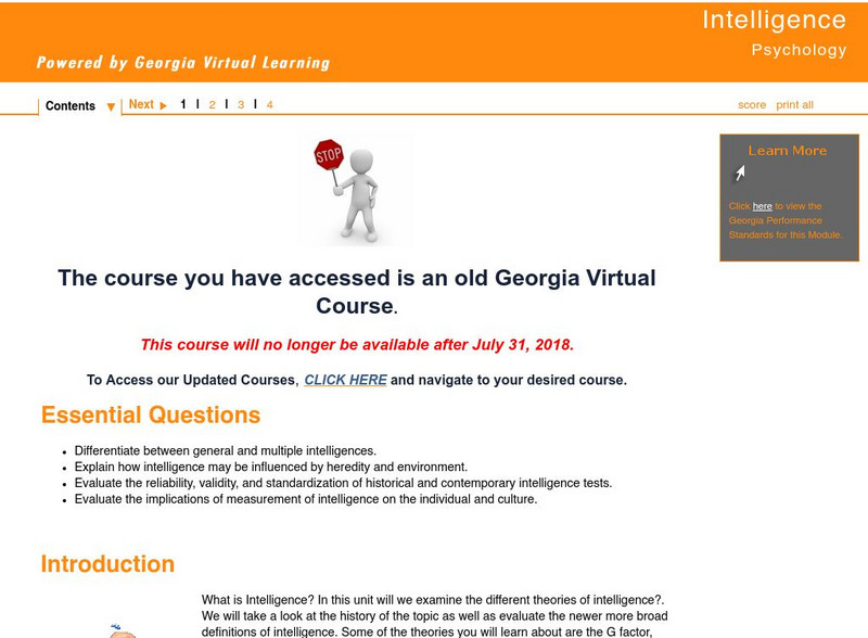 Virtual learning course in which students explore the abstract concept of Intelligence. Students can watch a presentation, read informational text, and participate with interactive learning material.