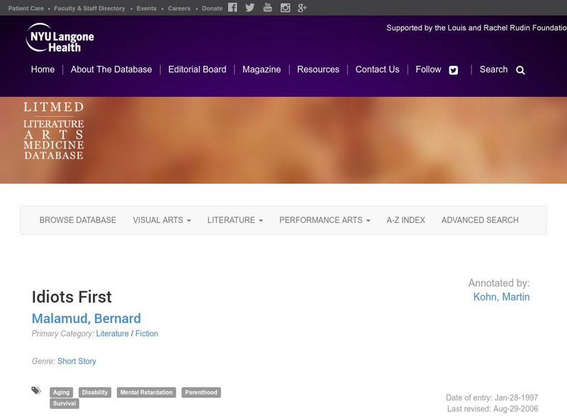 This webpage from New York University contains a summary of and commentary on Bernard Malamud's short story "Idiots First." A list of keywords with links to other works with similar subjects is also provided.