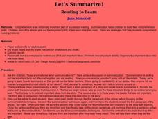 Students, after brainstorming what summarization is, practice the strategy of summarization to help pick out the important parts of text each time they read. They read and summarize the article, "10 Cool Things About Dolphins," from the...