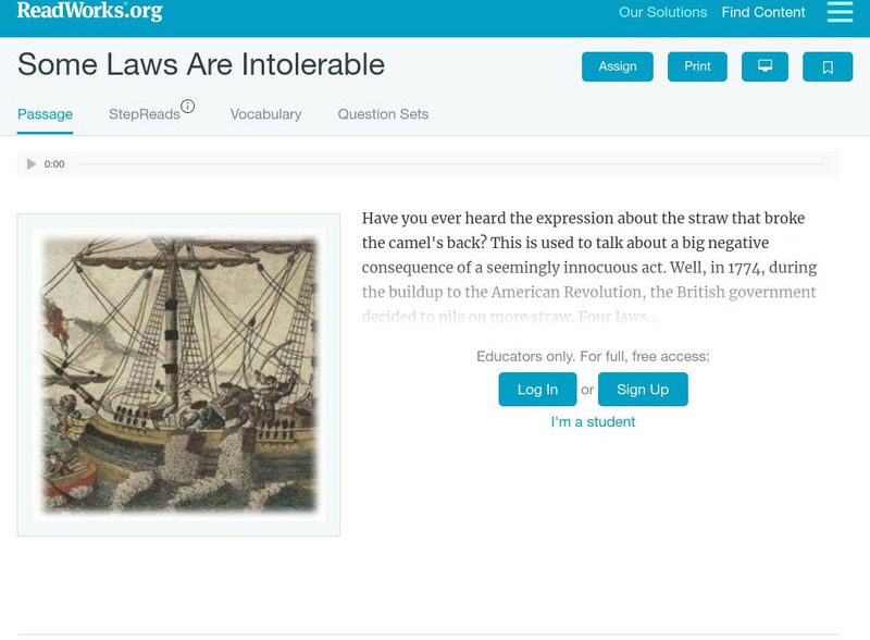 [Free Registration/Login Required] An informational text about the British Acts that lead to the Boston Tea Party and to the writing of the Declaration of Independence. A question sheet is available to help students build skills in...