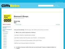 In this online interactive reading comprehension activity, students respond to 12 multiple choice questions about Emerson's Essays. Students may submit their answers to be scored.