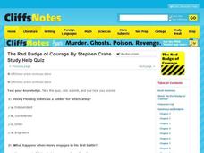 In this online interactive reading comprehension worksheet, students respond to 12 multiple choice questions about The Red Badge of Courage. Students may submit their answers to be scored.