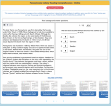 An informational reading sheds light on the history of the Pennsylvania colony. Scholars read the text, then answer 10 questions.