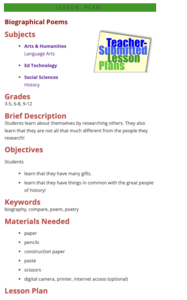 Students write a biographical poem about themselves. They observe a teacher-led demonstration, write an autobiographical poem and a biographical poem about a famous person using a template form, and display the poems side-by-side.