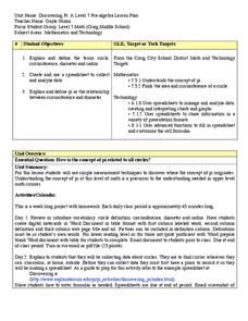 Define terminology related to a circle. Practice accuracy in measuring and then create a spreadsheet based on data collected from solving for parts of a circle. Groups can have fun analyzing their data as it relates to Pi.