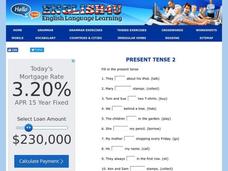 In this grammar quiz worksheet, students change the verb in parenthesis to present tense form to complete the sentences. Students complete an online grammar quiz using present tense.