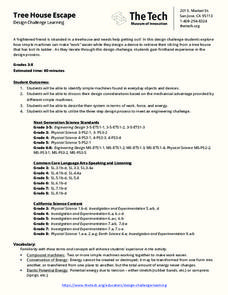 Use simple machines to escape from a tree house. Pupils learn about simple machines and how they are useful in everyday life in a STEM lesson. Groups then design a device to rescue a friend stuck in a tree house.