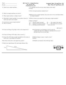 In this simple machines worksheet, students identify the 6 simple machines. They answer 21 questions about the types of simple machines, the output force of simple machines, the input force and the work involved in using a simple machine.