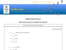 In this online interactive grammar skills worksheet, students answer 10 multiple choice questions regarding the use of simple present tense verbs. Students may submit their answers to be scored.
