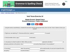 In this online interactive grammar skills worksheet, students answer 16 fill in the blank questions regarding the use of simple present, simple future, present continuous, and future continuous verbs. Students...